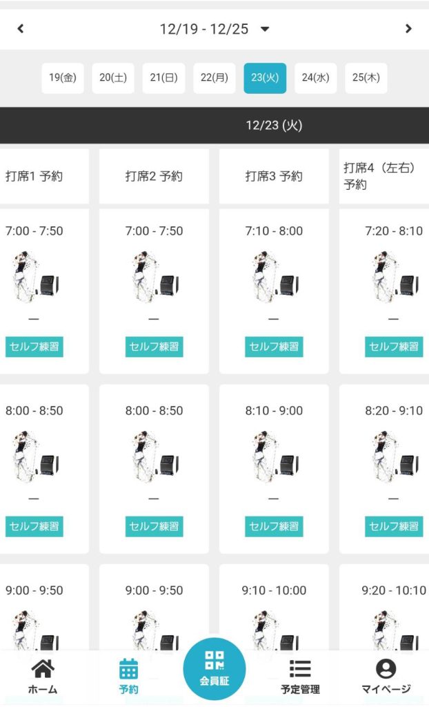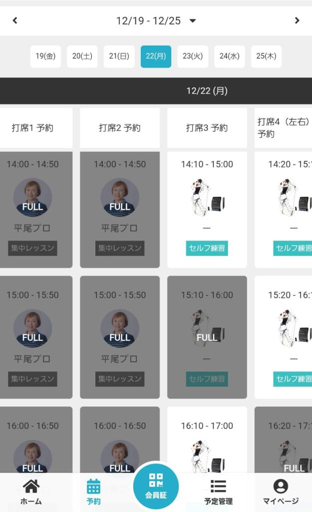 FULLの表示は既に別の会員様にご予約いただいている枠となりますが、クリックしてキャンセル待ち登録をすることも可能です。