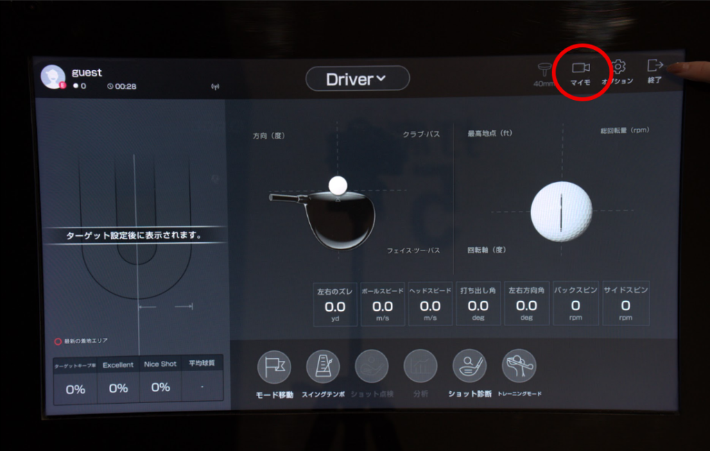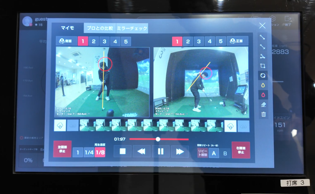 画面右上の<マイモ>というボタンを押していただくと、ご自身のスイングの映像がでてきます。