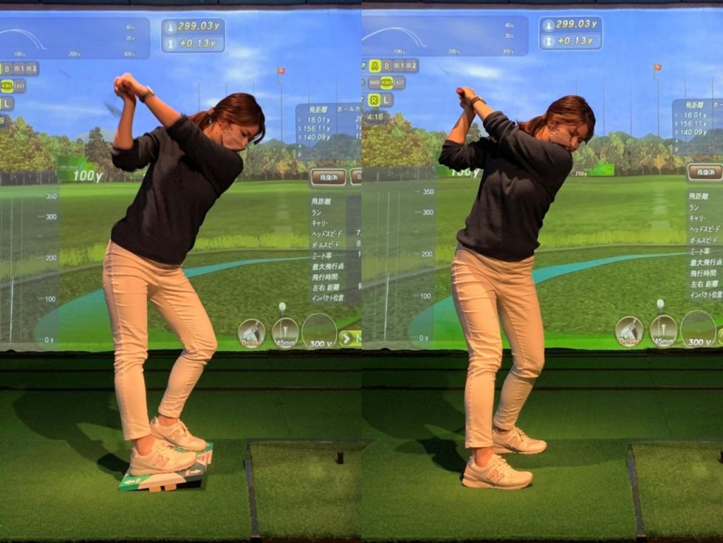 ・バックスイングでは右足、ダウンスイングでは左足に体重を移動させる感覚を掴みます。