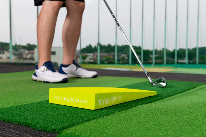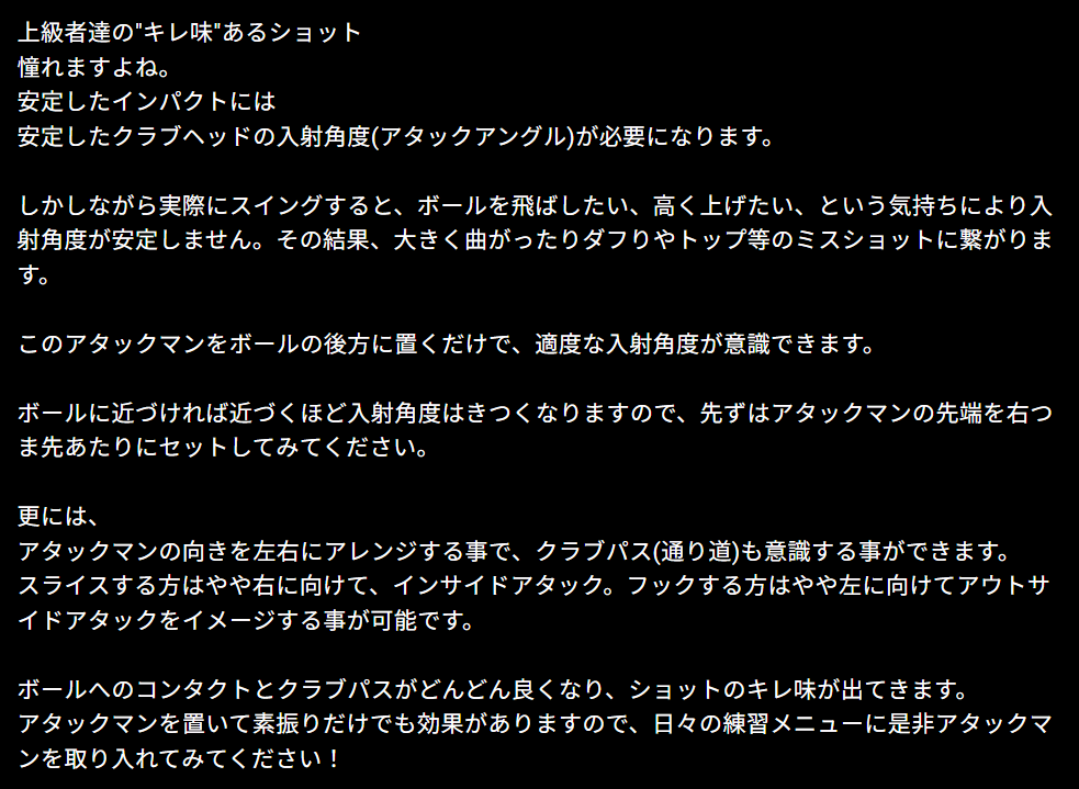 ・ボールに近づければ近づくほど、入射角度はきつくなります。・アタックマンの向きを左右にアレンジすることで、クラブパス(通り道)を意識することができます。